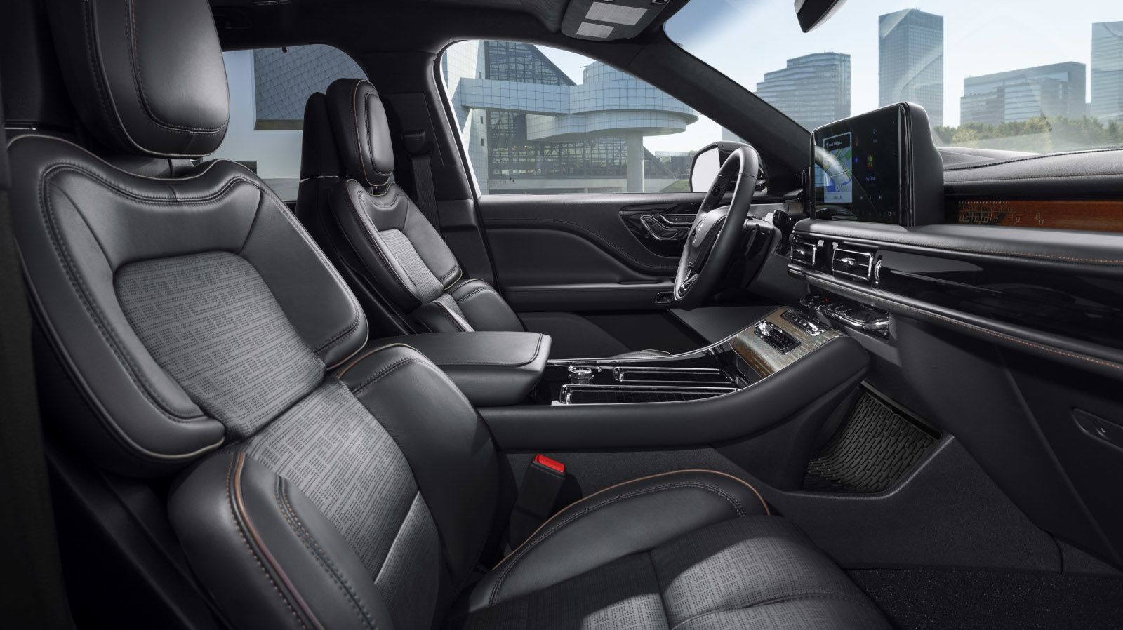 The Aviator features the Lincoln Digital Experience powered by Google Built-in. This system integrates Google Maps, Google Assistant, and Google Play store directly into the vehicle. The 13.2-inch touchscreen in the center stack works alongside a 12.4-inch digital cluster, creating dual displays that separate driver information from entertainment and navigation functions.